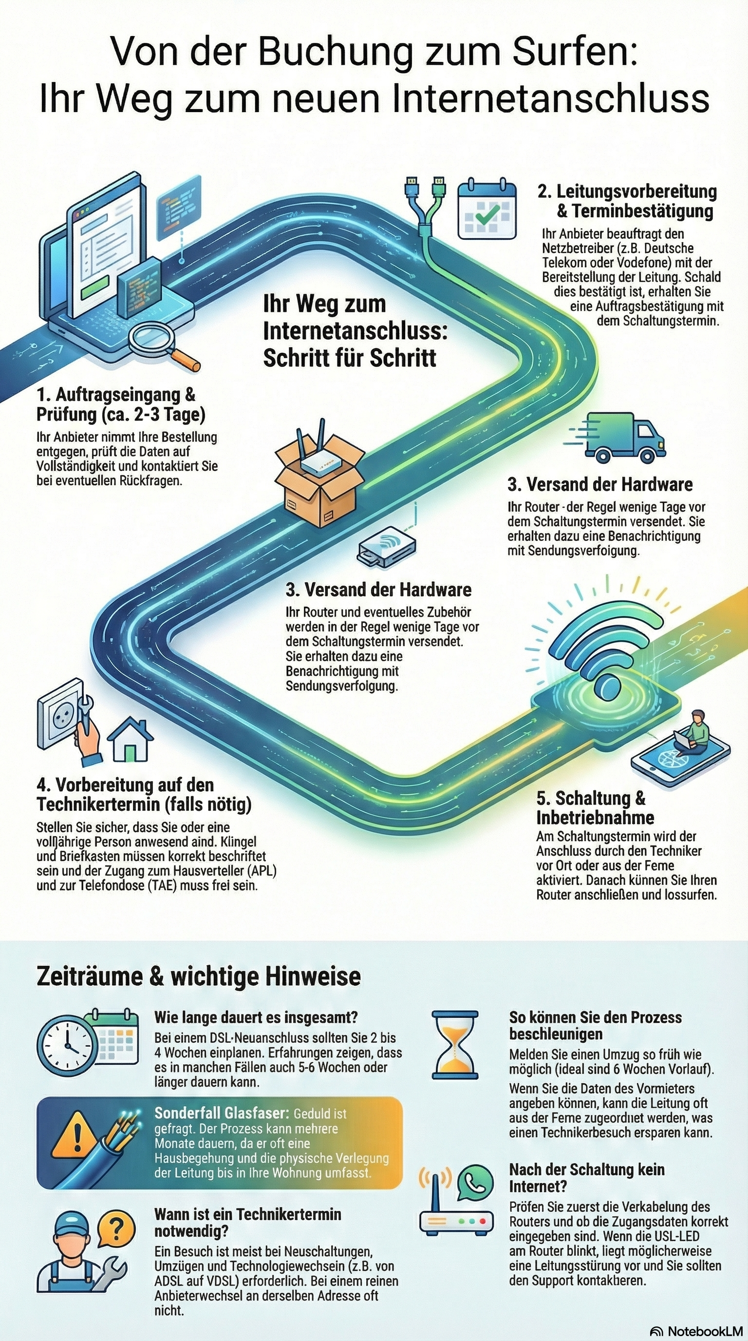 Nach der Buchung prüft der Anbieter die Leitung an Ihrer Adresse. Bei vielen Providern folgt die Bestätigung innerhalb weniger Werktage. Dort steht meist ein konkreter Bereitstellungstermin.